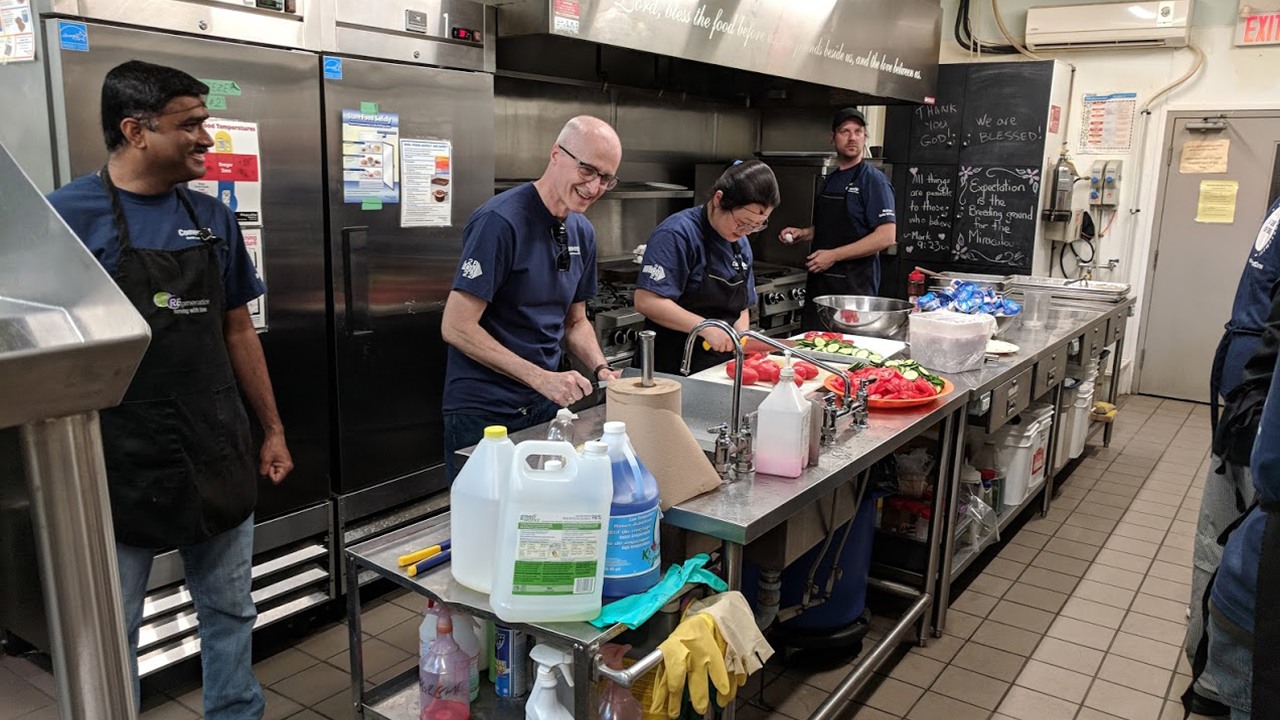 In addition to installing security cameras and surveillance technology, colleagues organized more than 27,000 pounds of food and prepared 19,625 meals, mended, built and installed fences, cleaned up grounds, painted, built homes, made minor repairs, power-washed, sorted clothes, installed 70 metal doors, served lunch to veterans, and repaired cubbies, benches, tables, and stairs.
